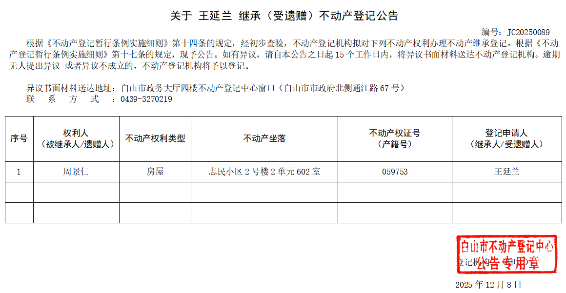 发布时间:2025-12-08 信息来源:白山市不动产登记中心 收藏