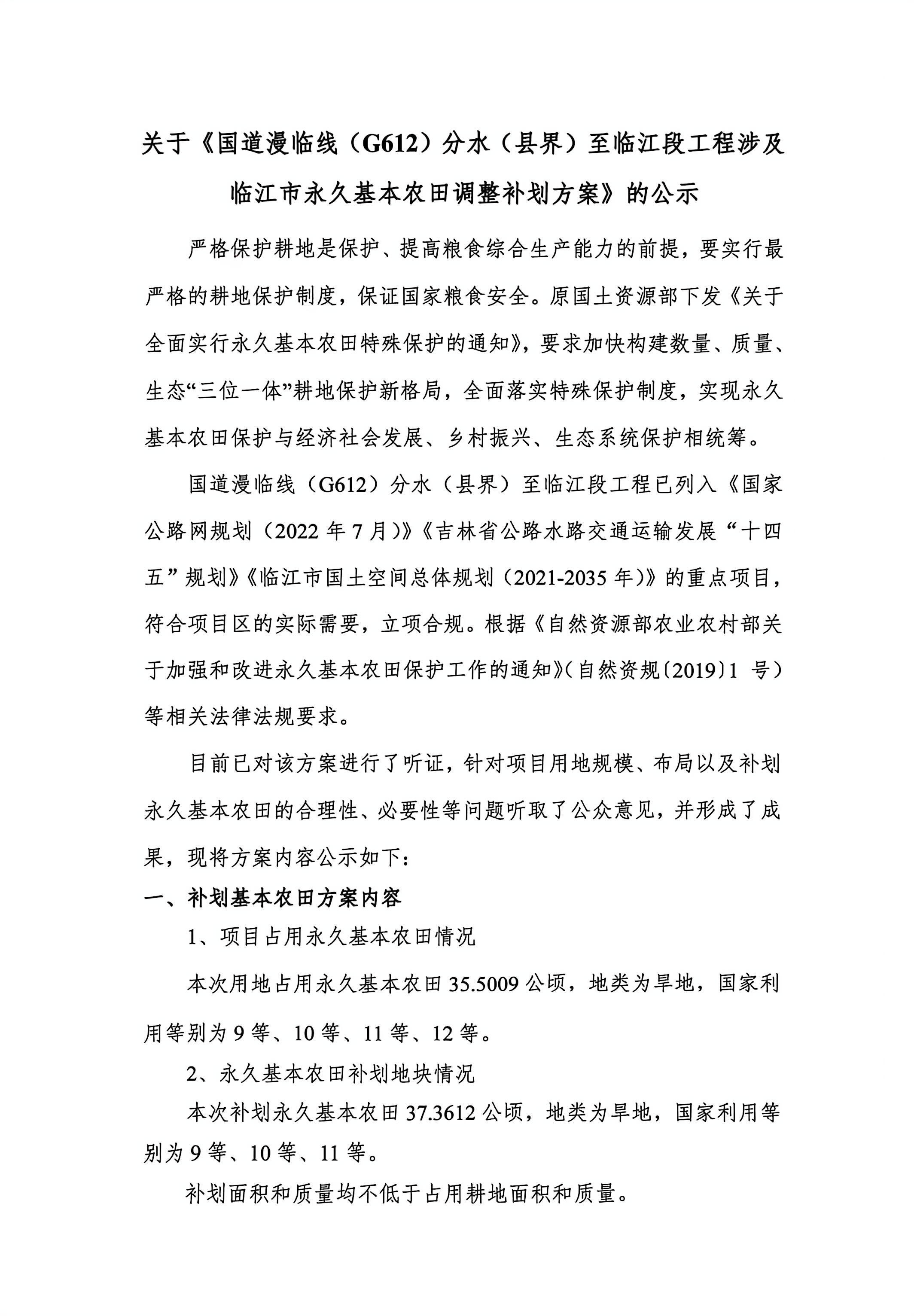 关于《国道漫临线(g612)分水(县界)至临江段工程涉及临江市永久基本农田调整补划方案》的公示