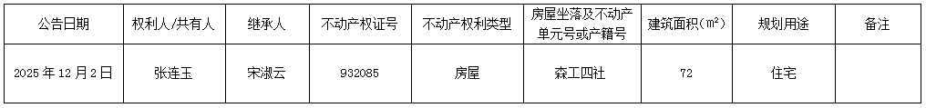 以下住房为权利人(共有人)所有财产,因权利人或共有人死亡,该不动产由继承人继承。继承人于公告之日提供了不动产权属所需继承相关材料并签署了继承协议书,申请以下不动产继承登记。现根据《物权法》、《不动产登记暂行条例实施细则》和《不动产登记操作规范(试行)》之规定,对该申请进行审查并予公告。