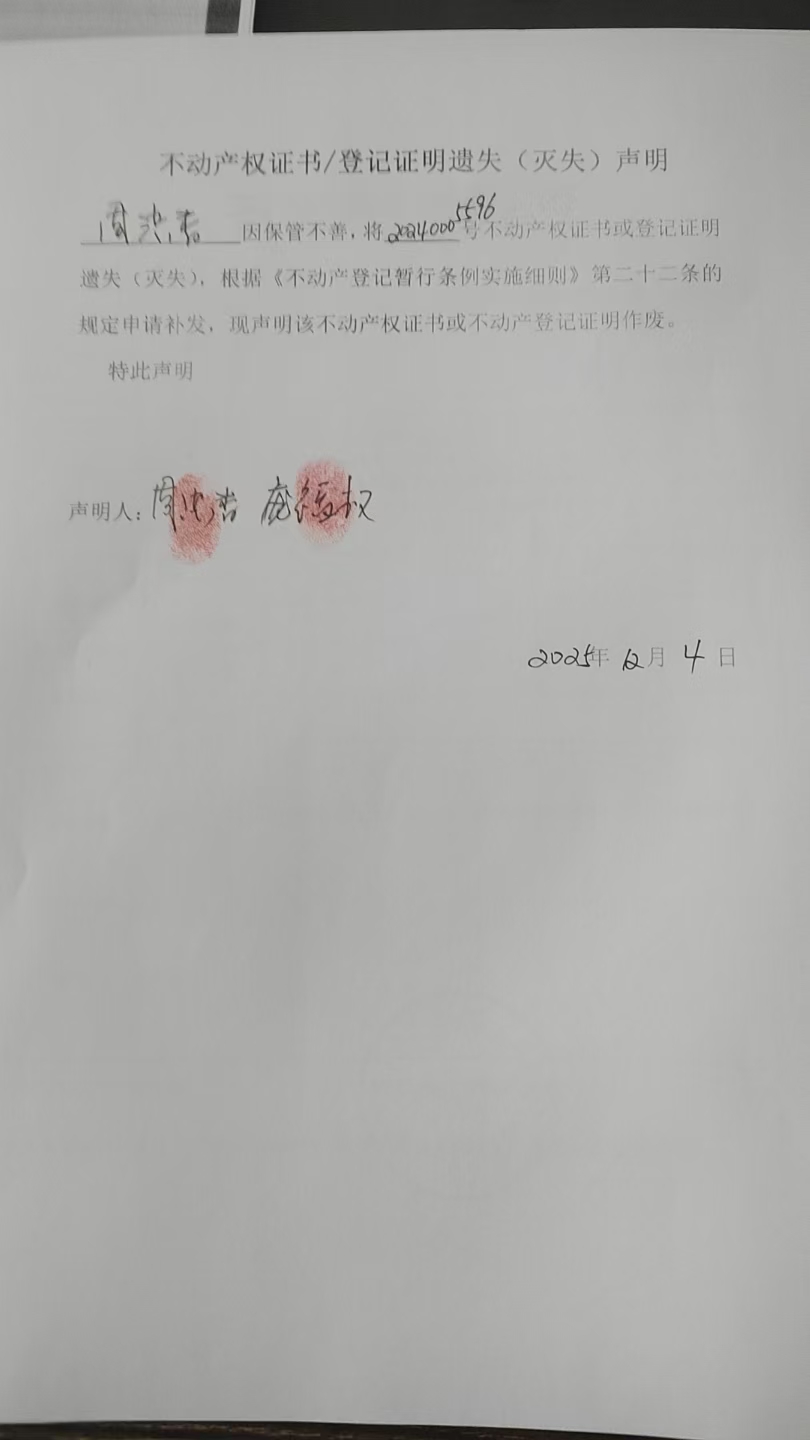 不动产登记证书遗失声明