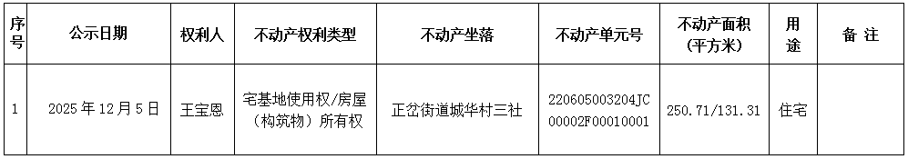 经初步审定,我机构拟对下列不动产权力予以首次登记,根据《不动产登记暂行条例实施细则》第十七条的规定,现予公告。如有异议,请自本公告之日起1个工作日内将异议书面材料送达我机构。逾期无人提出异议或者异议不成立的,我机构将予以登记。
