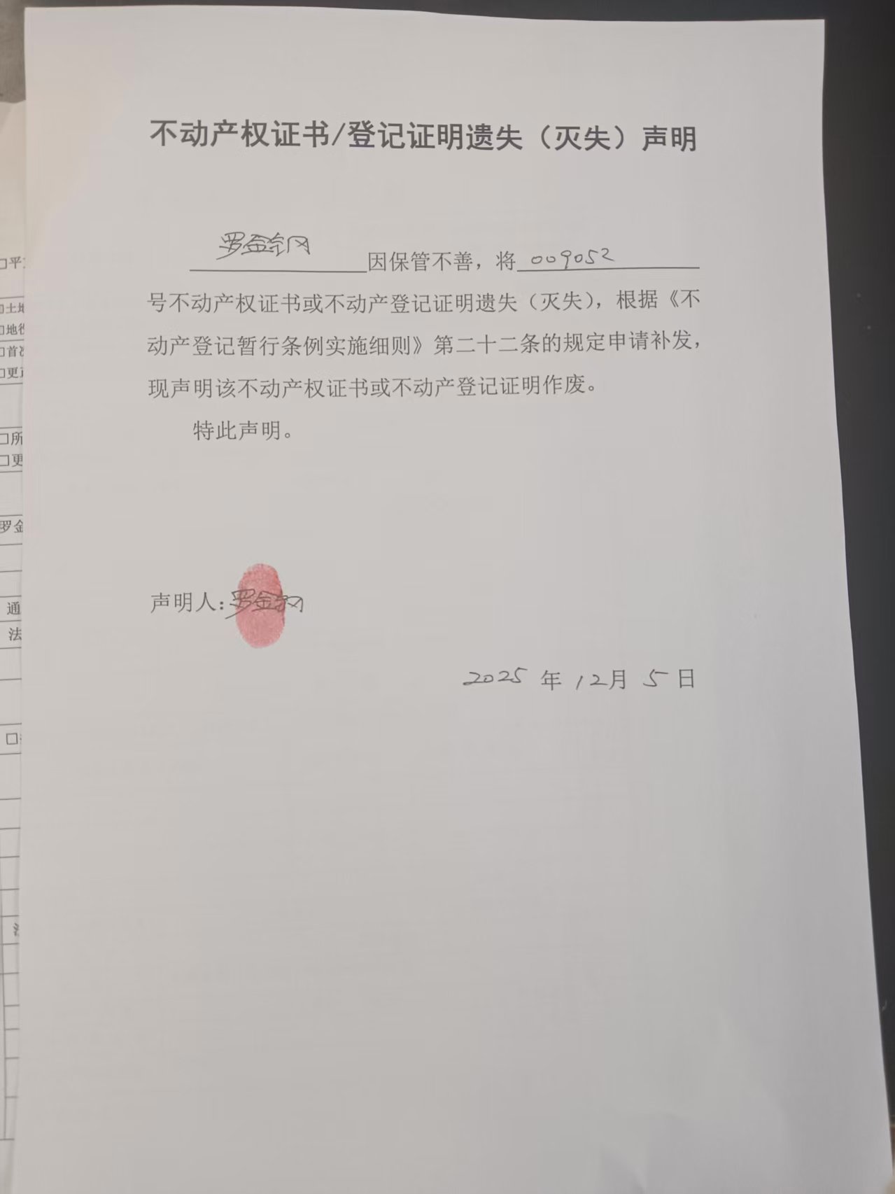 不动产权证书/登记证明遗失(灭失)声明